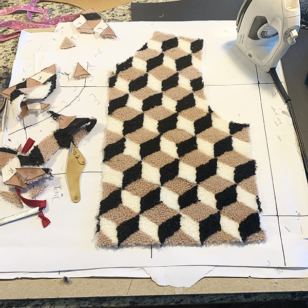 Jake: “A Black Napa Shearling with a black and white intarsia hem. Each piece was cut separately and sewn in like a puzzle. I also have a tri-colored shearling intarsia vest in the works.”